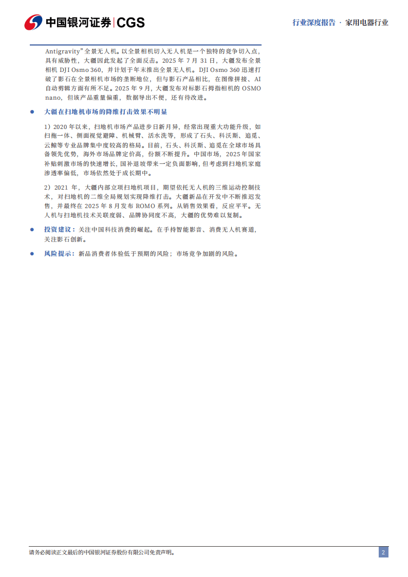 相比之下,大疆在扫地机器人市场的尝试尚未取得突破。2025年推出的ROMO系列因技术关联度弱、品牌协同不足,且面临石头科技、科沃斯等专业品牌的激烈竞争,市场份额长期徘徊在低个位数水平。这一案例反映出,科技企业的跨界扩张需以核心技术为支撑,否则难以在红海市场中突围。