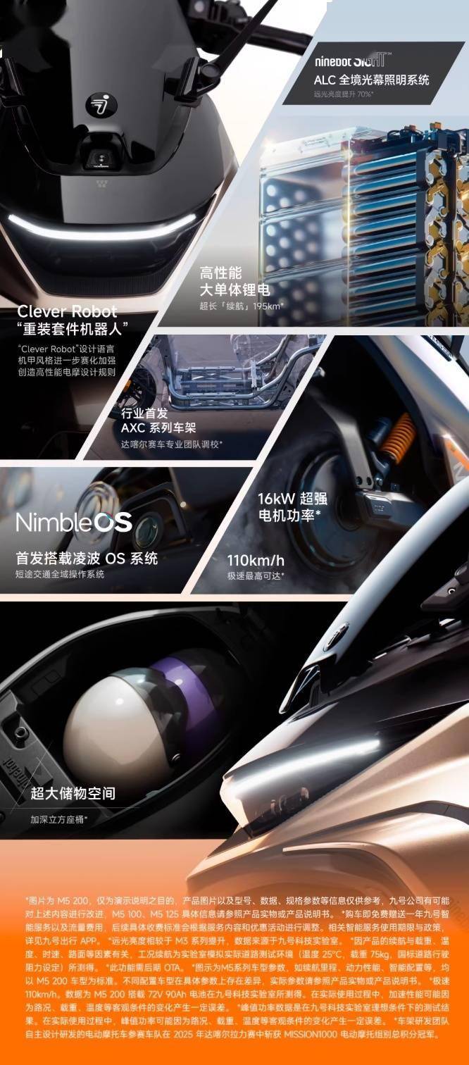 作为九号电动高端系列的代表作,M5 P 千万台纪念版基于本月早些时候发布的M5 200车型升级打造。该系列主打旗舰级设计理念,首次在行业中应用AXC系列车架技术,配合峰值功率达16kW的高性能电机,最高时速可突破110公里。车辆搭载的NimbleOS智能系统支持高德、百度双地图导航,配备5英寸全贴合TFT彩色显示屏,可实时显示骑行数据及导航信息。