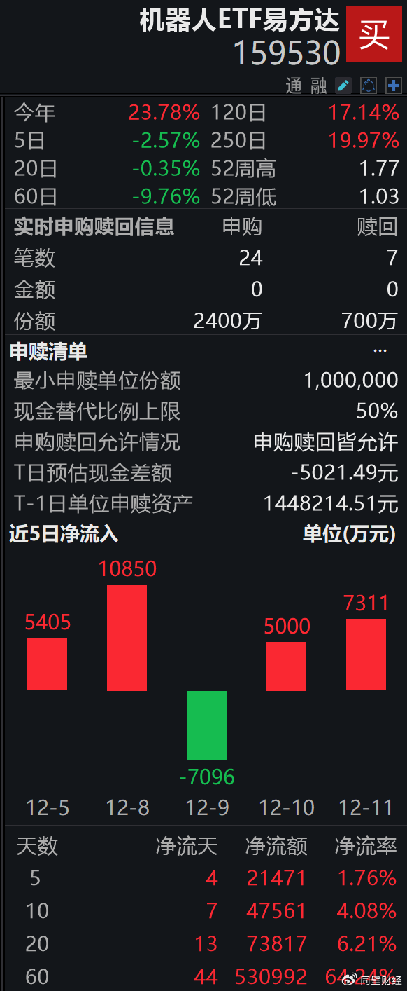 今日早盘,国证机器人产业指数(980022)出现小幅回调,截至10时整跌幅为0.67%。成分股表现分化明显,航天智装、石头科技、昊志机电分别上涨1.44%、1.29%和1.1%,而奥比中光、凌云光、兆威机电则下跌3.35%、2.54%和2.51%。市场资金持续涌入机器人板块,跟踪该指数的机器人ETF易方达(159530)近10日吸金超4.7亿元,近60日资金净流入突破53亿元,最新规模达124.42亿元,成为同类产品中唯一规模突破百亿的ETF基金。截至发稿时,该ETF盘中再获1700万份净申购。